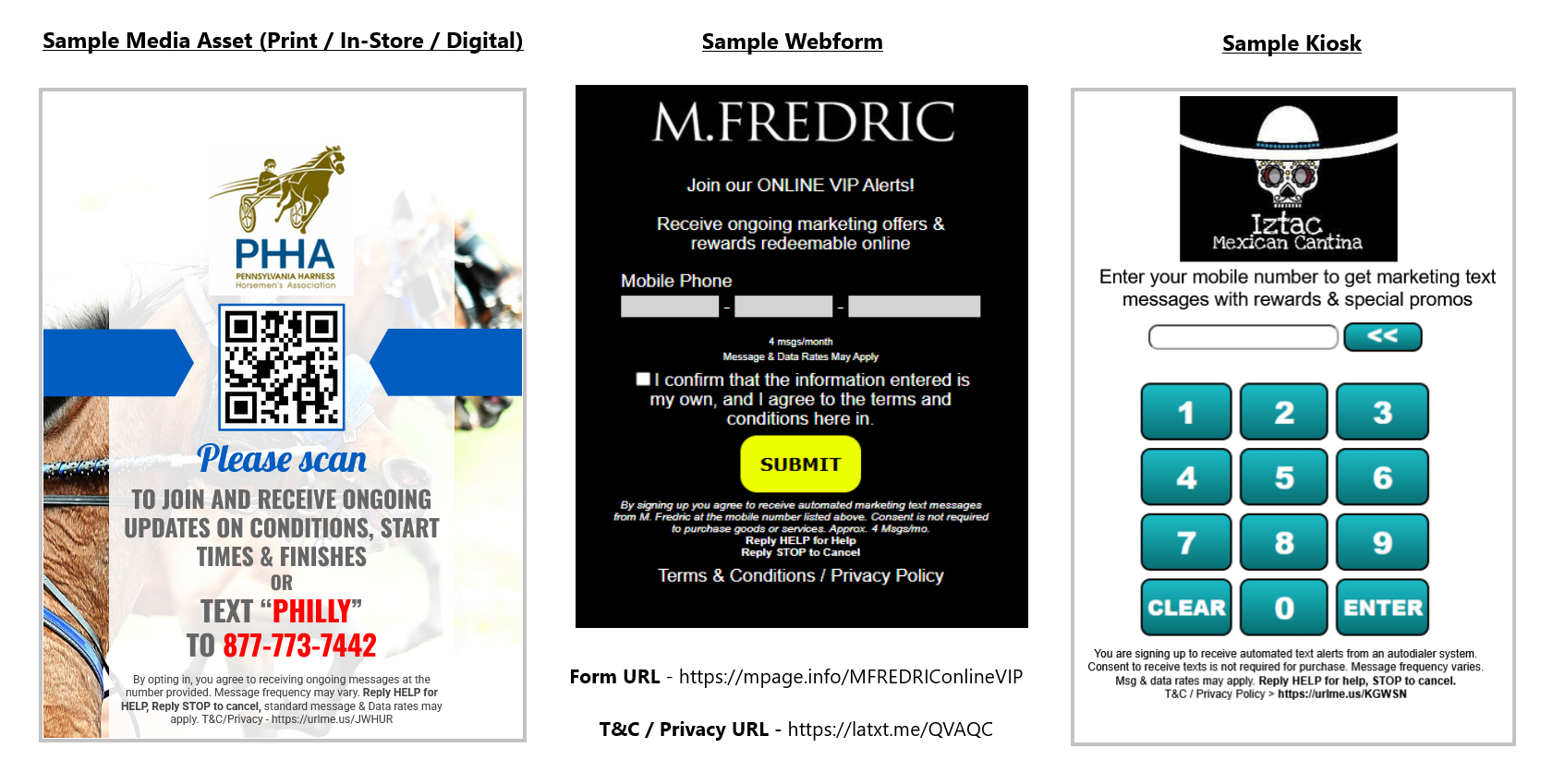 - Otherwise, if a Webform or Kiosk is solely use to join text opt-in, then "opt-in flow" must explain how the webform or kiosk is encountered by the consumer, and that the interface is used solely for the purpose of opting-in to text messaging.